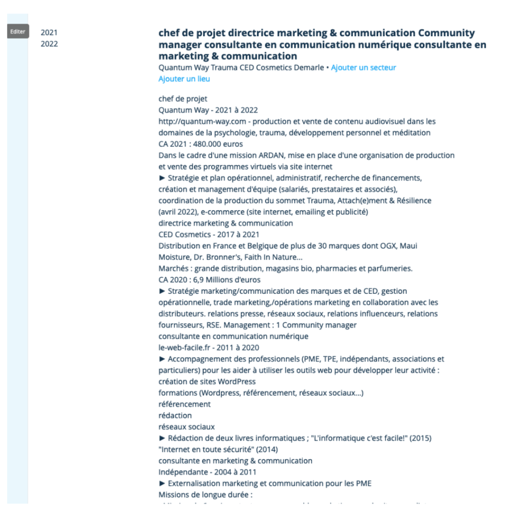Il y a environ 1 mois, Météo Job a changé son système et modifie systématiquement mon profil chaque fois que j’utilise un nouveau CV (ce qui est de base très con quand on nous conseille de modifier notre CV à chaque annonce). Et là c’est le drame : Météo Job mélange tout : les postes, les entreprises et les mots je deviens donc « chef de projet/directrice marketing et communication/community manager/consultante dans une société qui s »appelle « Quantum Way/CED/Demarle » (en réalité 3 entreprises différentes).