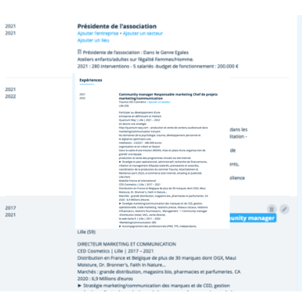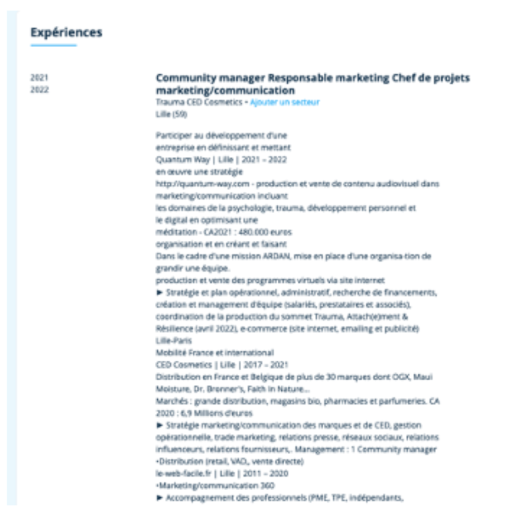 Je vois passer sur les réseaux un ami qui se forme sur l’ATS de sa société, je lui demande alors le grand service de tester mon CV ce qu’il accepte (qu’il en soit remercié). Le résultat est navrant (pour mon CV). Je deviens directrice marketing et communication de DIsney (ce qui est faux) et certaines de mes expériences essentielles disparaissent (ou plutôt sont mixées avec d’autres postes) : ce qui est rassurant dans cet ATS (Teamtailor) au moins dans son réglage est que ce n’est qu’un résumé qui apparait au dessus du CV mais c’est quand même ce que lit en premier le recruteur…