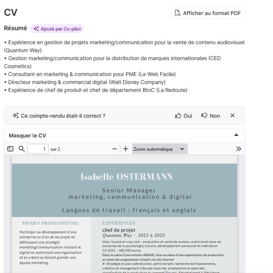 Je vois passer sur les réseaux un ami qui se forme sur l’ATS de sa société, je lui demande alors le grand service de tester mon CV ce qu’il accepte (qu’il en soit remercié). Le résultat est navrant (pour mon CV). Je deviens directrice marketing et communication de DIsney (ce qui est faux) et certaines de mes expériences essentielles disparaissent (ou plutôt sont mixées avec d’autres postes) : ce qui est rassurant dans cet ATS (Teamtailor) au moins dans son réglage est que ce n’est qu’un résumé qui apparait au dessus du CV mais c’est quand même ce que lit en premier le recruteur…