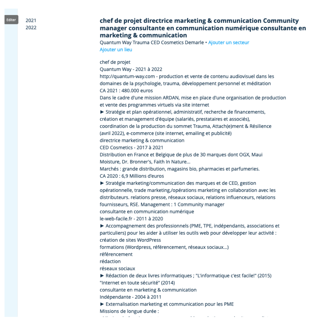 Il y a environ 1 mois, Météo Job a changé son système et modifie systématiquement mon profil chaque fois que j’utilise un nouveau CV (ce qui est de base très con quand on nous conseille de modifier notre CV à chaque annonce). Et là c’est le drame : Météo Job mélange tout : les postes, les entreprises et les mots je deviens donc « chef de projet/directrice marketing et communication/community manager/consultante dans une société qui s »appelle « Quantum Way/CED/Demarle » (en réalité 3 entreprises différentes).